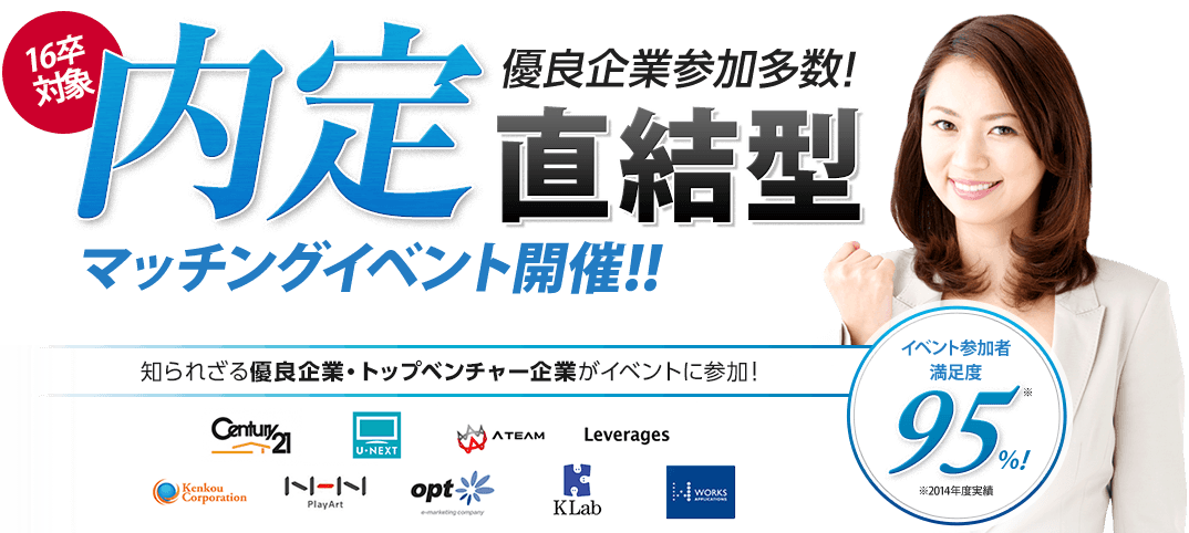 あなたの希望と適正を冷静に見極め、質の高いマッチングだけを追求。その結果、イベント参加者の96%が理想の企業に就職を決めていくという、他では絶対に真似できない数字を残しています。